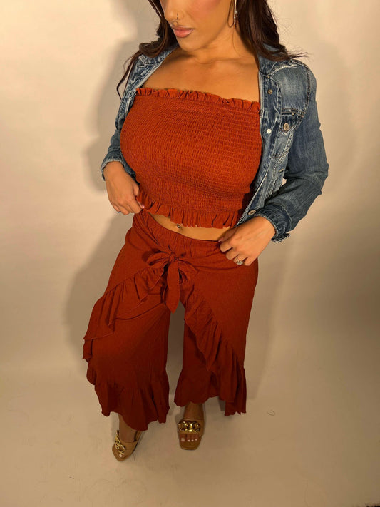 Shirred Hem Tie Front Wide Leg Flowy Pants