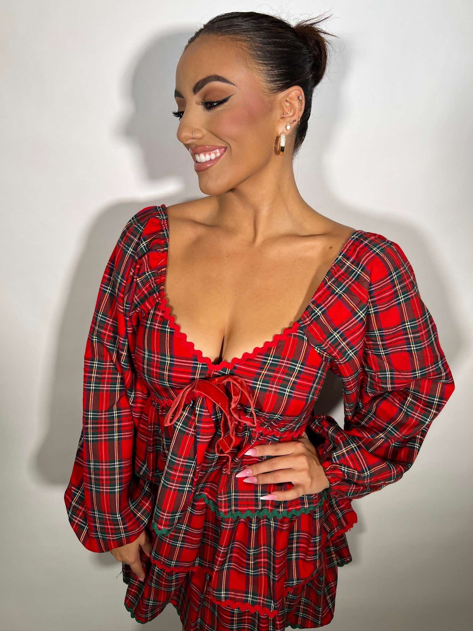 From cozy gatherings to festive celebrations, the Holiday Glam Plaid Mini Dress is the perfect mix of charm and style.